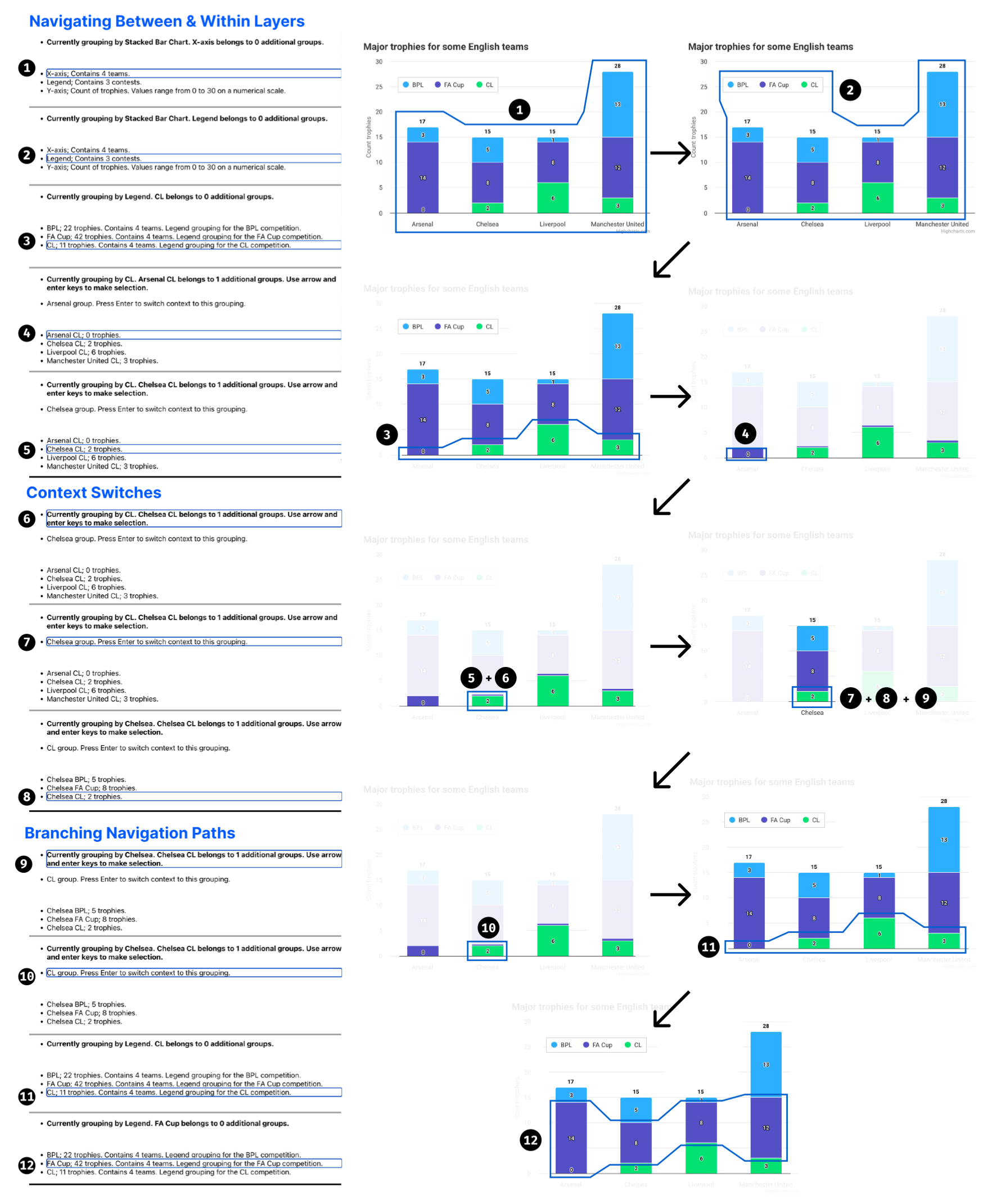 Walkthrough of a usage scenario showing how Marina navigates a stacked bar chart using Benthic. The left-hand side shows 12 interface states as Marina moves between different groupings in the chart and context switches during her exploration. The right-hand side summarizes this sequence using numbered illustrations that correspond to each of the 12 steps. In each illustration, the blue outlined box shows Marina’s current location, while the shaded area highlights the context she is currently exploring. Other parts of the chart are visually faded to reduce distraction. Together, these views show how Benthic reveals structure step by step, helping Marina build understanding as she explores the stacked bar chart.